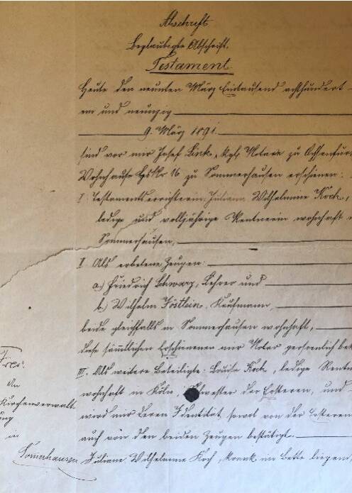 Testamentsauszug von Wilhelmine Koch 1891 mit Angaben des Notars zu Wilhelmines geistiger Verfassung und Luises Verzicht auf ihr Erbe.