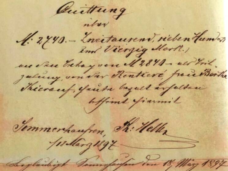 Quittung über den Erhalt von 2.840 Mark und Garantie von zehn Jahren für die „Bürgerglocke“ der Firma Ph. Heller vom 18.März 1897, beglaubigt von Bürgermeister Gottlieb Wenninger (aus dem Gemeindearchiv Sommerhausen). Repro: Irene Meeh