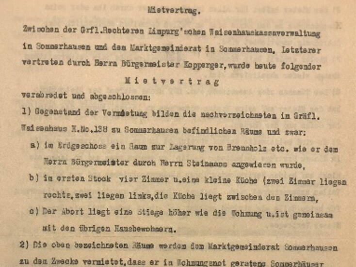 Im Gemeindearchiv haben sich etliche Gesuche an die gräfliche Herrschaft erhalten mit der Bitte um Aufnahme in das Waisenhaus, die fast ausnahmslos genehmigt wurden. Meistens handelte es sich um alte gebrechliche Personen, die ihrem Lebensunterhalt nicht mehr nachgehen konnten und um eine Herberge ersuchten. Indes wurde der jungen Zimmermann’schen Familie 1881 eine Absage erteilt, da diese die Bedingungen für eine Aufnahme nicht erfüllten. Allerdings entschied der Cameralamtmann im Auftrag der wohltätigen Grafen, diese aus der Stiftung zu unterstützen. „Dagegen unterliegt es keinem Anstande, dem Zimmermann resp. der Armenpflege zur Beschaffung einer Wohnung einen Mietzinsbeitrag aus der Waisenhauskasse zu leisten, wenn ein hierauf bezüglicher Antrag gestellt werden wird.“ Daraufhin wurde ihnen 10 Mark Unterstützung aus dem Fond der Waisenhauskasse gewährt. Aus jüngerer Zeit sind ferner Mietverträge zwischen der Gräflich Rechteren Limpurg’schen Waisenhauskassaverwaltung und dem Marktgemeinderat in Sommerhausen aus dem Jahr 1929 und 1932 vorhanden, die über die Anzahl der Räumlichkeiten Aufschluss geben und den Zweck ausdrücklich darlegen. Im Erdgeschoss konnte Brennholz gelagert werden, der zweite Stock besaß zwei größere und vier kleinere Zimmer, eine Küche und einen Vorplatz. Über dem zweiten Stockwerk befand sich noch ein Bodenraum. „Die sämtlichen Räume werden dem Marktgemeinderat Sommerhausen zu dem Zwecke überlassen, dass er in Wohnungsnot befindliche Sommerhäuser Einwohner darin aufnehmen kann.“ Die Witwe Anna Seidel mit ihrer Tochter und der Obsthändler Valentin Horbelt mit Ehefrau teilten sich laut Mietvertrag 1929 die Wohnung im 2. Stock und zahlten jeweils 12 Reichsmark Monatsmiete.