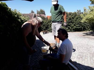 Im August und September wurde unsere Dreschhalle neu gestrichen. Wahrscheinlich war es der erste Anstrich seit ihrem Bau in den 50-er Jahren. Dass die Halle schon sehr lange nicht gestrichen wurde, haben die ehrenamtlichen „Anstreicher“ sehr schnell gemerkt. Sie mussten mehrmals Farbe nachkaufen. Das Holz hat den neuen Glanz wie ein Schwamm aufgesogen.