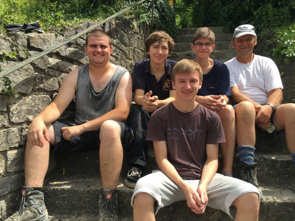 Christoph Balk, Luca van Musscher, Maurizio van Musscher und Quirin Schönbuchner von der Freiwilligen Jugendfeuerwehr Sommerhausen haben zusammen mit ihrem „Chef“ Winfried Wagner die Stufen im Sommerhäuser Friedhof im Bereich des Kreuzes beseitigt.