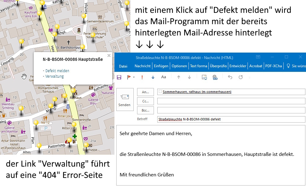 Sie möchten uns z.B. eine defekte Straßenlaterne melden? Dafür haben wir bereits eine Flüstertüte "Straßenbeleuchtung"! Sie kommen direkt zu einer interaktiven Karte. Mit einem Klick auf „Defekt melden“ kann man direkt eine E-Mail ins Rathaus senden: