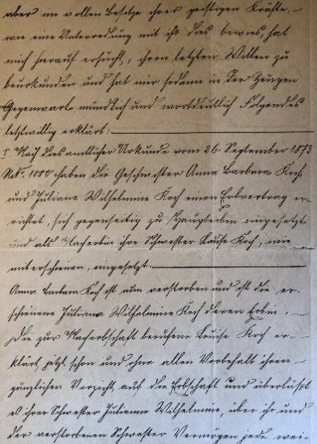 Testamentsauszug von Wilhelmine Koch 1891 mit Angaben des Notars zu Wilhelmines geistiger Verfassung und Luises Verzicht auf ihr Erbe.