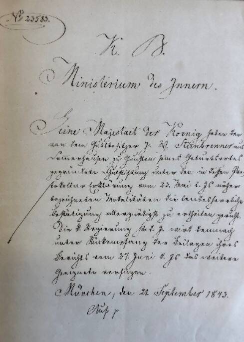 Am 21. September 1843 wird die Stiftung von der königlichen Regierung von Unterfranken und Aschaffenburg bestätigt. Das Ministerium sorgt für die nutzbringende Anlegung des Kapitals. In dem vorhandenen Sammelakt befinden sich zahlreiche Rechnungen von Buchhandlungen in Würzburg (Stahel’sche Buchhandlung, Julius Staudingers Buchhandlung, A. Stubers Buchhandlung) und Nürnberg (Johann Philipp Raw’sche Buchhandlung), die den Kauf verschiedener Bücher belegen, die als Prämien an die Schüler ausgegeben wurden. Überwiegend handelt es sich um Jugendschriften sowie Erzählungen aus der Kirchengeschichte, Bücher zur Reformationsgeschichte, aber auch Schriften zur Obstbaumzucht, Schul- und Lesebücher werden aufgeführt. Eine Rechnung der Buchhandlung A. Stuber in Würzburg vom 26.1.1867 für die Wohllöbl. Steinbrenner’sche Schulstiftung listet 17 bestellte Bücher auf, die unter anderen den Schulmeister von Caspari und Hoffmanns Erzählungen beinhaltet. Über das verwendete Kapital und die erwirtschafteten Zinsen wurde genau Buch geführt wie die handschriftlichen Aufzeichnungen und Quittungen dokumentieren.