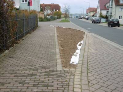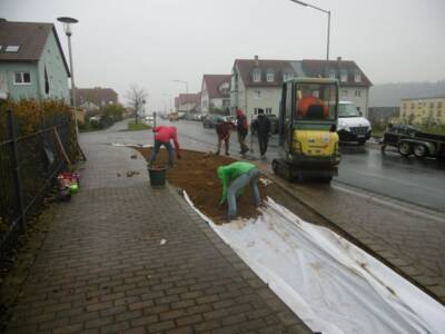 Eine weitere Aktion war das Anlegen eines Silberstreifes in der Ochsenfurter Straße. Pflanzen, die in sehr mageren Boden gepflanzt und mit Zierschotter abgedeckt wurden.