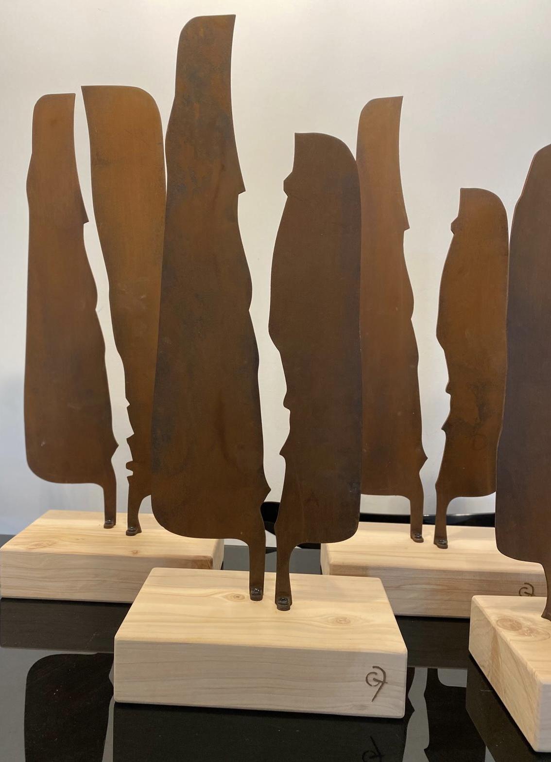 Die Materialkonfiguration der Skulpturen aus Gips und Eisen stellt Figuren dar, die an die Werke von Pietro Consagra erinnern lassen und die mit den Gemälden im Raum interagieren: Ein kraftvoller, fast dramatischer, manchmal geisterhafter Effekt, der von den rauen Leinwänden und Jutetüchern auf die Oberflächen ausstrahlt.