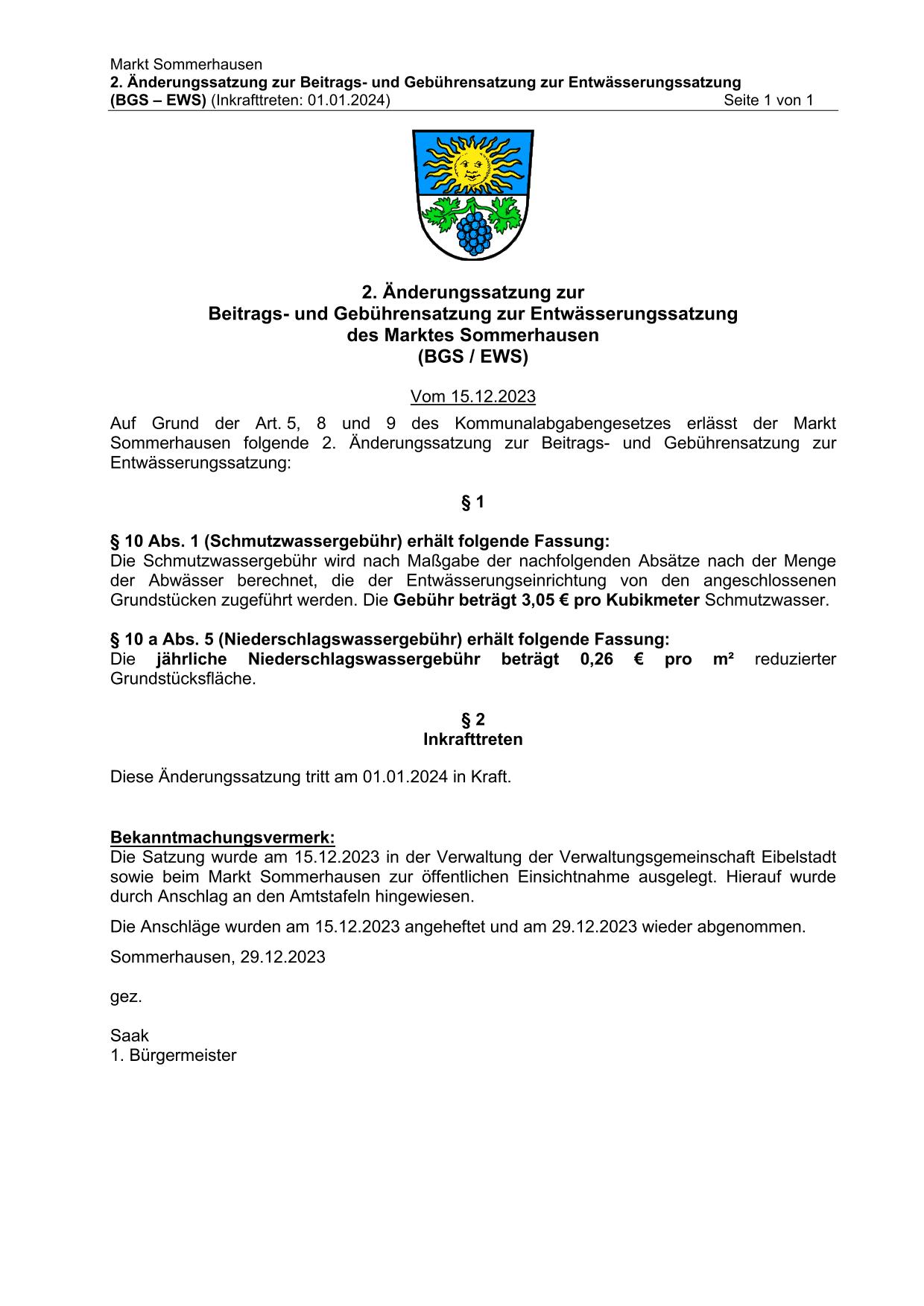 2. Änderungssatzung zur Beitrags- und Gebührensatzung zur Entwässerungssatzung des Marktes Sommerhausen (BGS / EWS)