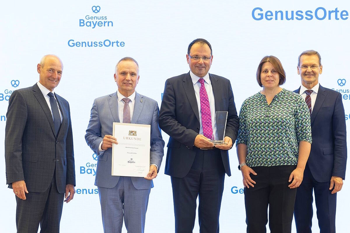 Bei der Preisverleihung: Dr. Johann Niggl (von links), Leiter der Abteilung Tourismus am Staatsministerium für Ernährung, Landwirtschaft, Forsten und Tourismus, Bürgermeister Wilfried Saak, Staatssekretär Martin Schöffel, die Leiterin der Tourist-Info Waltraud Schiedermair und Richard Balling vom Ministerium. Foto: Giulia Iannicelli